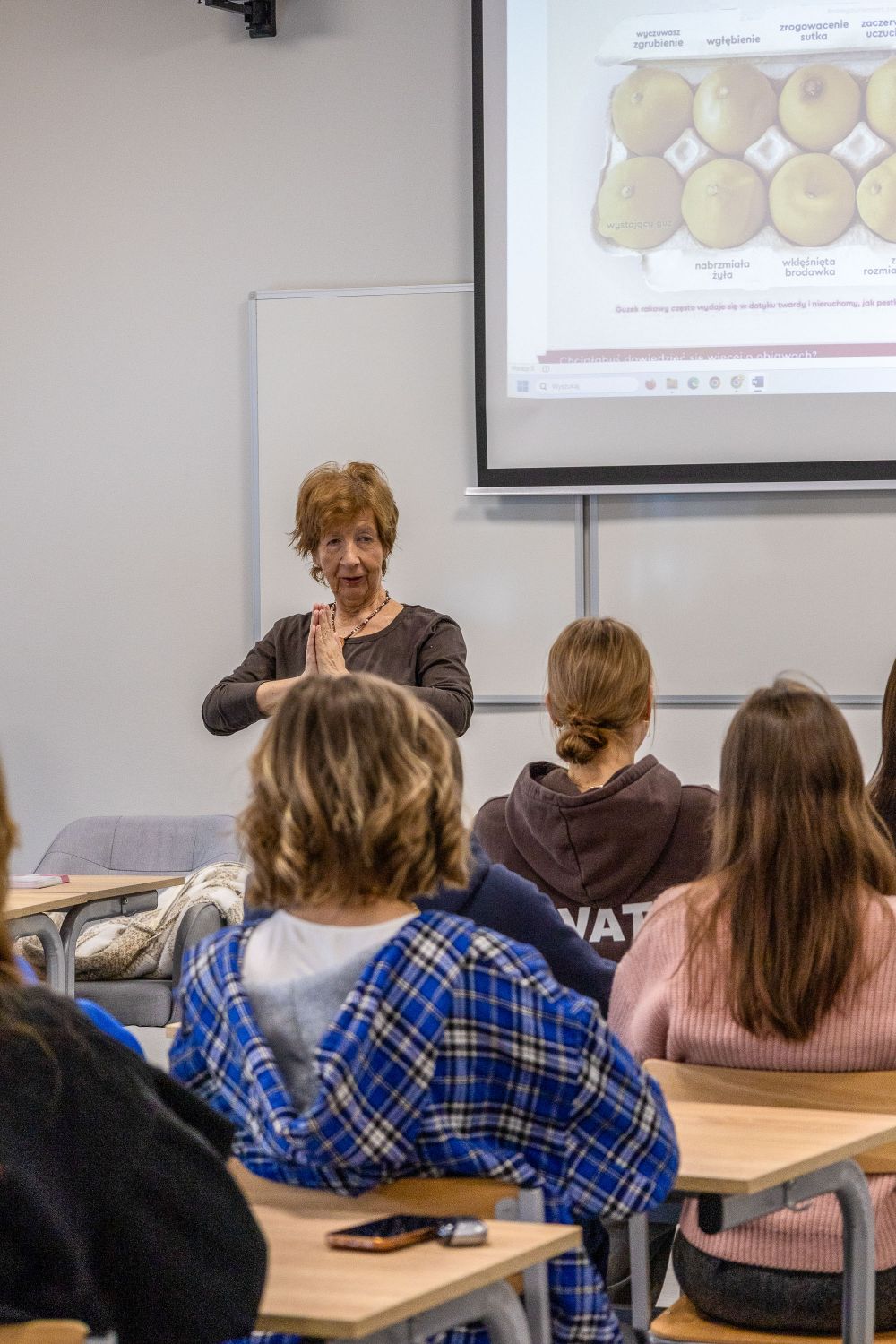 Ważnym punktem programu było spotkanie z przedstawicielką Stowarzyszenia Podhalańskich Amazonek - panią Ewą Palider. Przybliżyła ona uczniom temat profilaktyki raka piersi oraz znaczenie badań profilaktycznych.