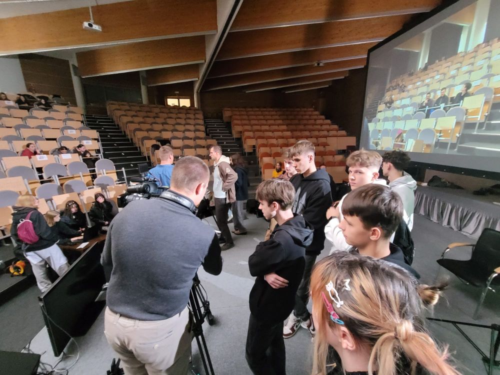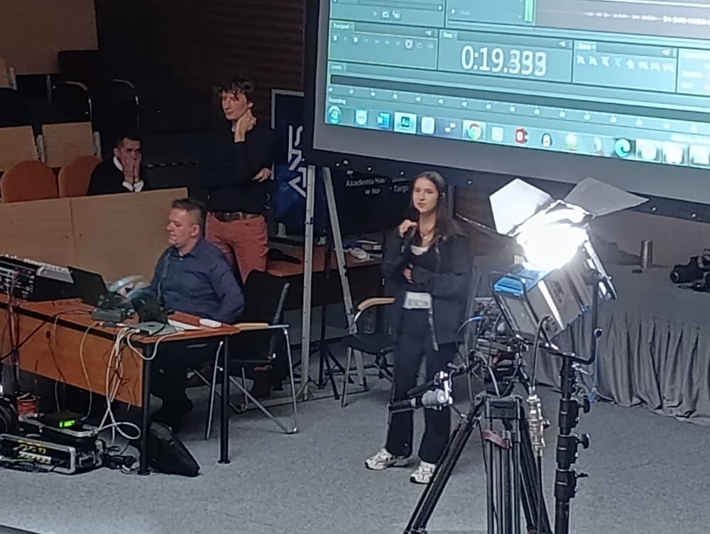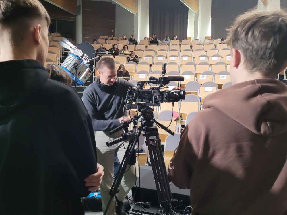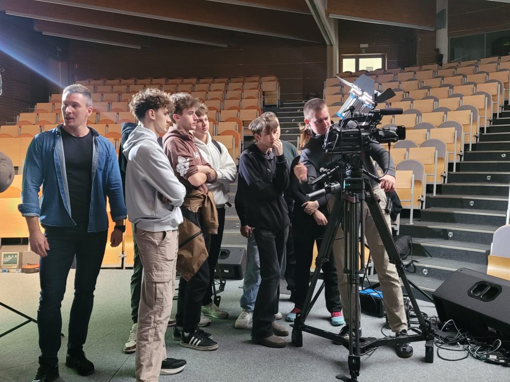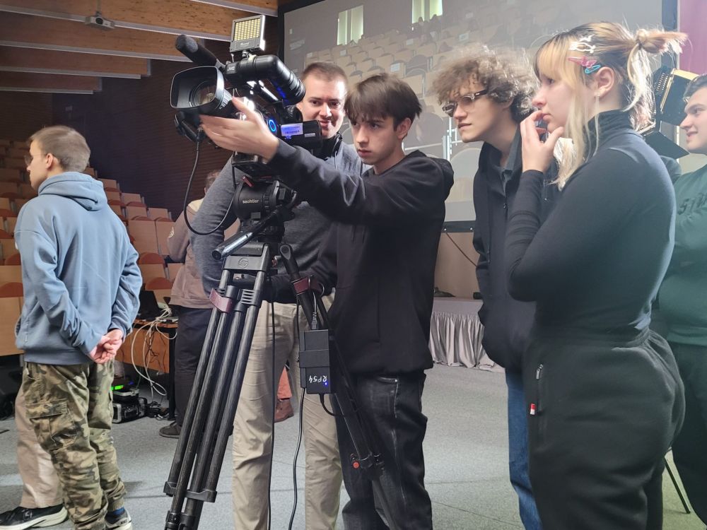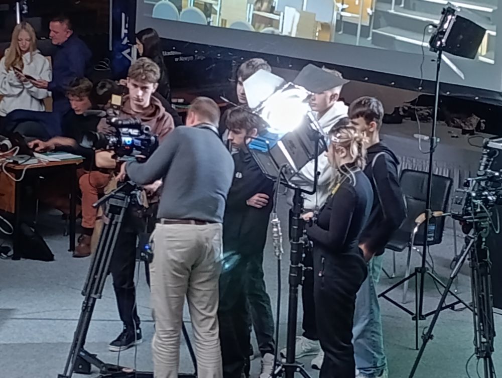 Pierwszy blok poświęcony był telewizji. Uczestnicy dowiedzieli się, jak działa greenscreen, poznali podstawy pracy z kamerą i kadrem oraz znaczenie różnych ujęć filmowych. W programie nie zabrakło również zabawy, uczniowie wcielili się w prezenterów prognozy pogody oraz mieli okazję z bliższa przyjrzeć się profesjonalnym kamerom. Spotkanie zostało urozmaicone występem muzycznym jednego z uczestników.