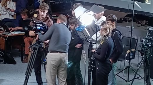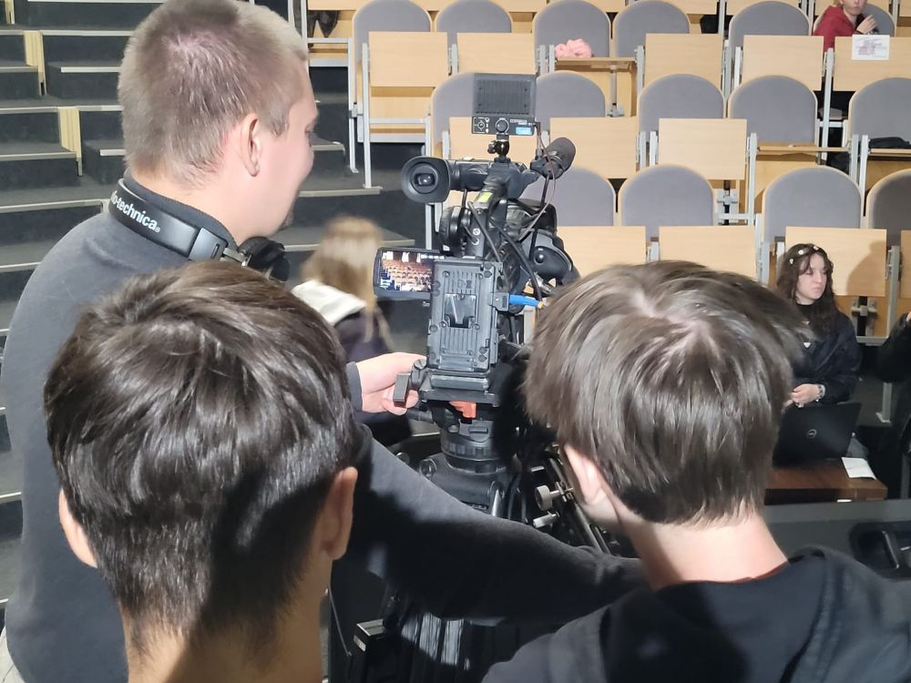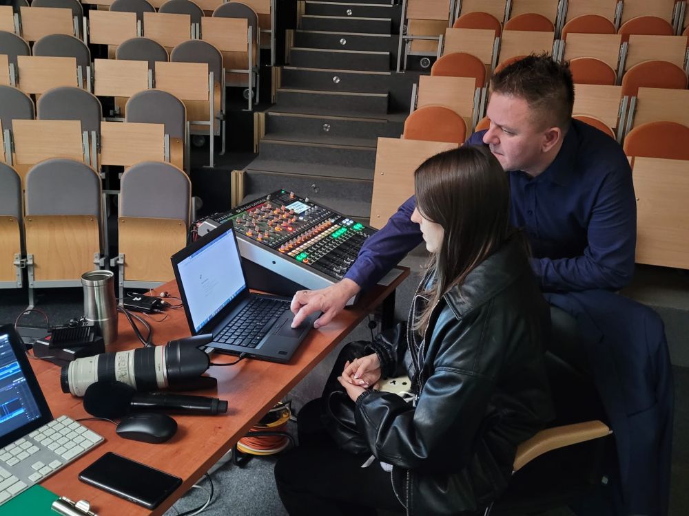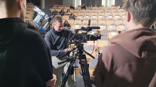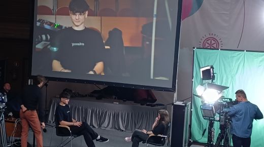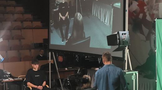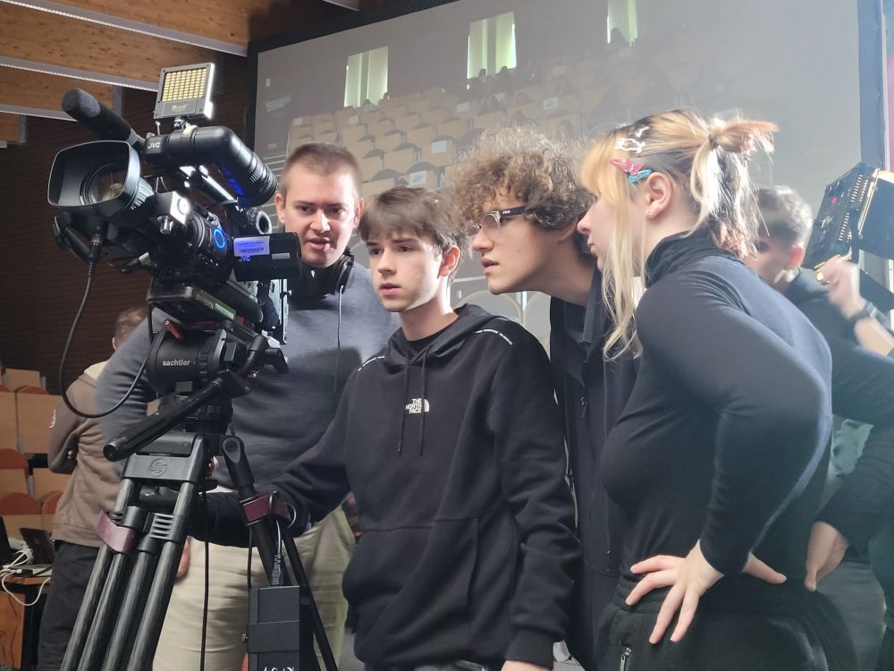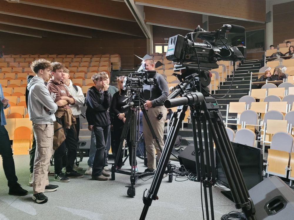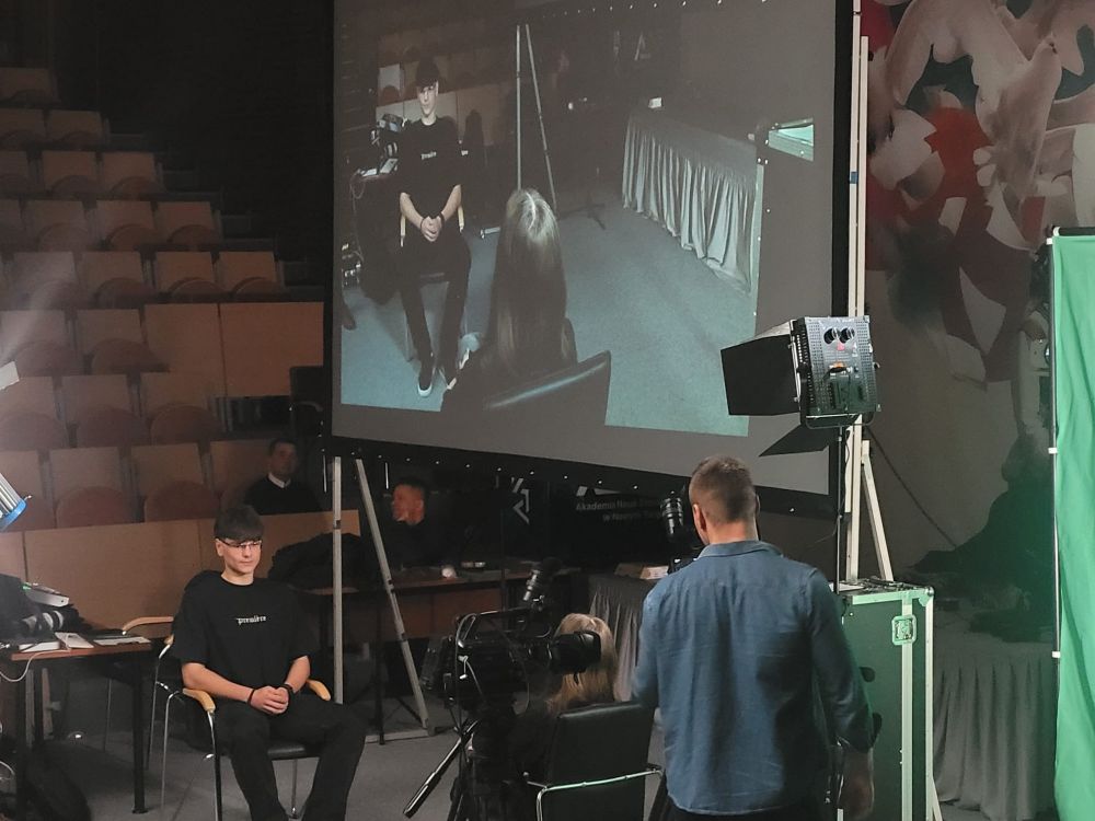 Pierwszy blok poświęcony był telewizji. Uczestnicy dowiedzieli się, jak działa greenscreen, poznali podstawy pracy z kamerą i kadrem oraz znaczenie różnych ujęć filmowych. W programie nie zabrakło również zabawy, uczniowie wcielili się w prezenterów prognozy pogody oraz mieli okazję z bliższa przyjrzeć się profesjonalnym kamerom. Spotkanie zostało urozmaicone występem muzycznym jednego z uczestników.